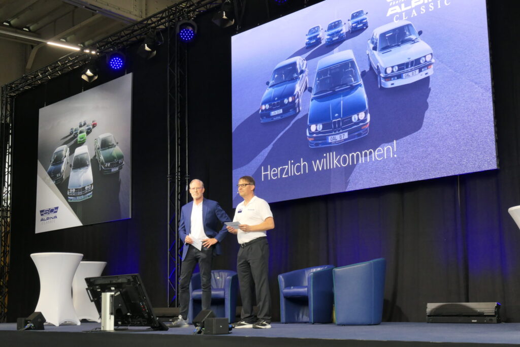 格納庫内のステージでは、「ALPINAの軌跡」「モータースポーツの歴史」「技術革新の歩み」などをテーマに、ALPINA社代表アンドレアス氏とフローリアン氏による講演が行われ、満席の会場からはALPINAへの深い関心と敬意が感じられました。